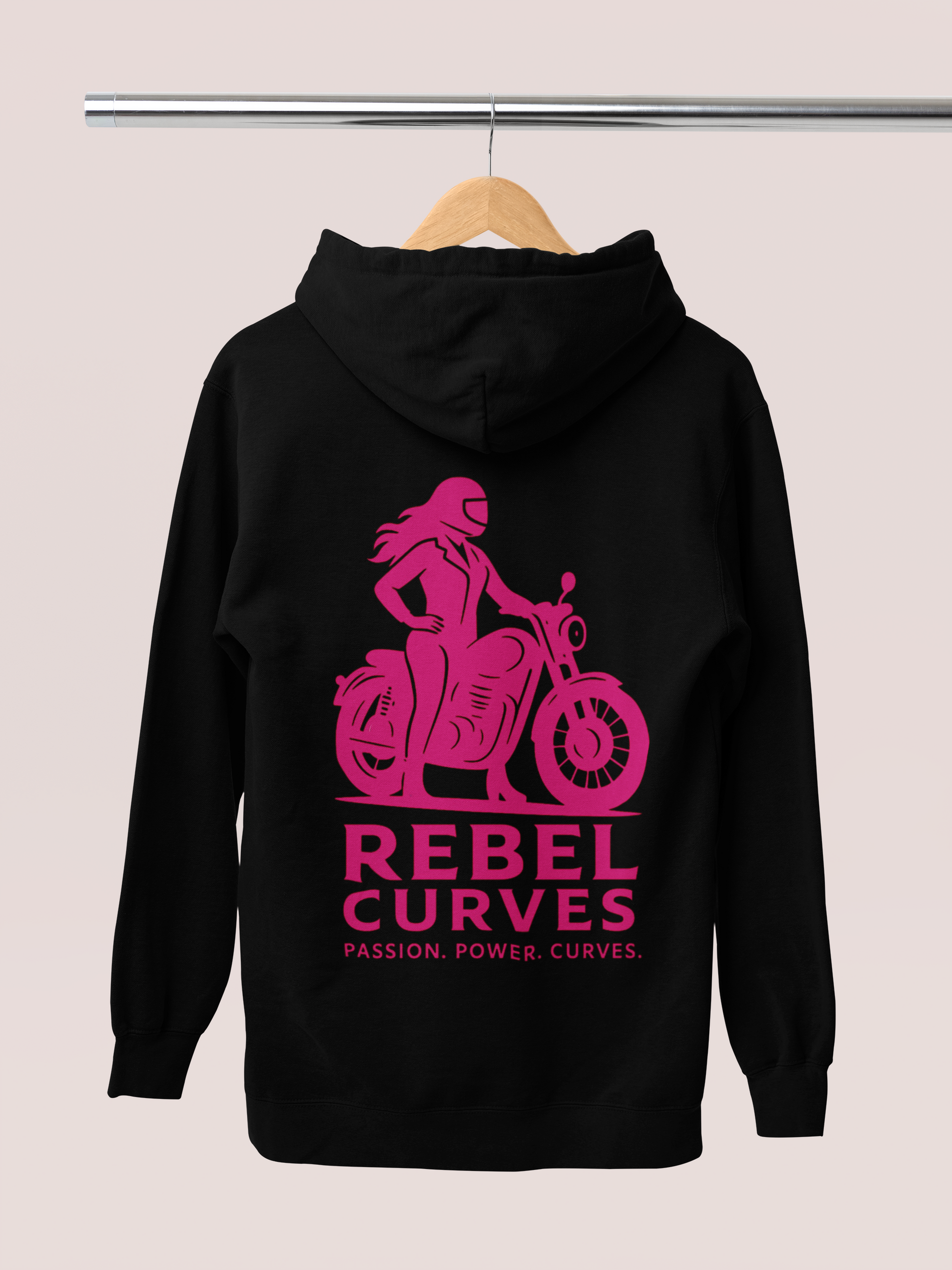 Ride with style, comfort, and confidence. The Rebel Curves Casual Hoodie is more than just a hoodie—it’s a statement. Designed for women who live life on two wheels (and those who love the lifestyle), this black hoodie with bold pink artwork celebrates Passion. Power. Curves.