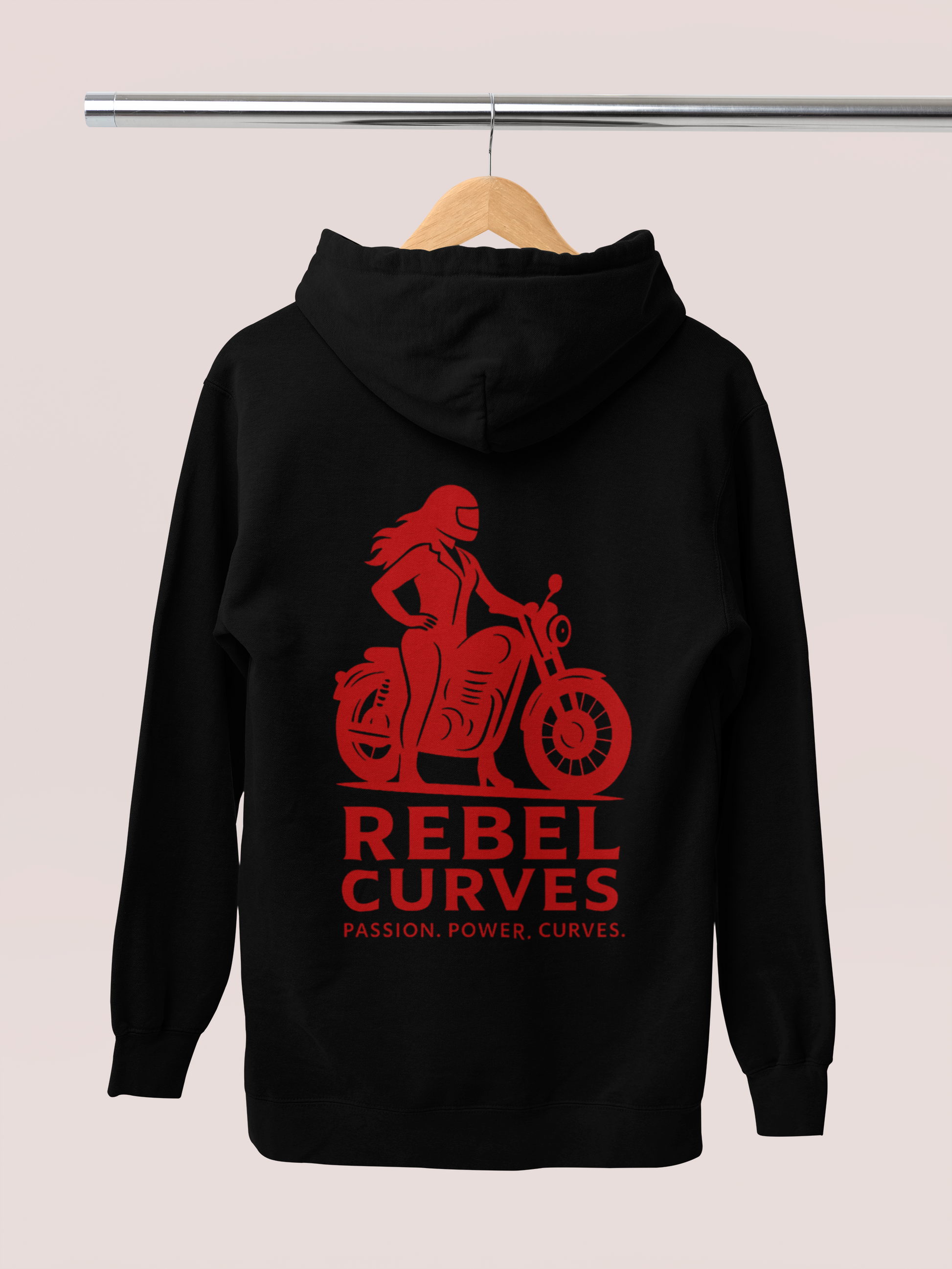Ride with style, comfort, and confidence. The Rebel Curves Casual Hoodie is more than just a hoodie—it’s a statement. Designed for women who live life on two wheels (and those who love the lifestyle), this black hoodie with bold red artwork celebrates Passion. Power. Curves.