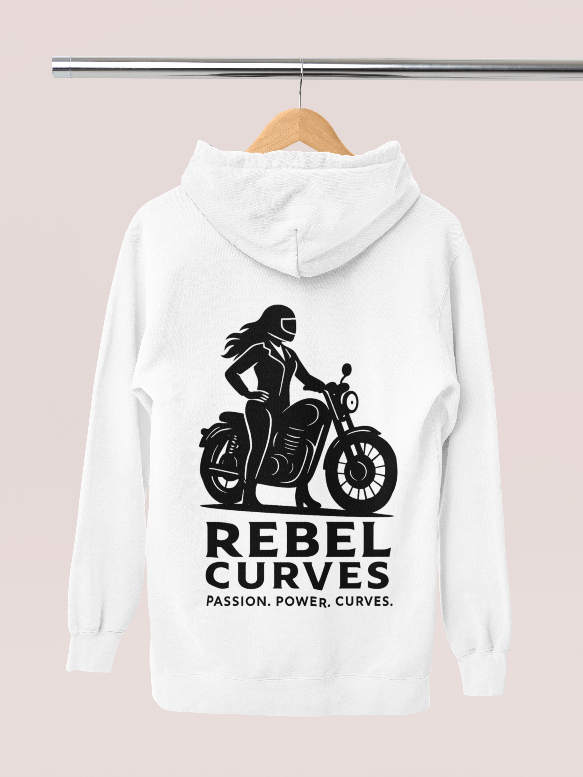 Ride with style, comfort, and confidence. The Rebel Curves Casual Hoodie is more than just a hoodie—it’s a statement. Designed for women who live life on two wheels (and those who love the lifestyle), this white hoodie with bold black artwork celebrates Passion. Power. Curves.